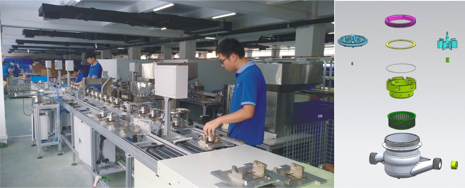 智能水表自动线的功能特点:自动上料,自动识别定位、自动铆压、自动组合,自动旋压。其自动线的输送方式:以电机带动倍数链的输送方式。